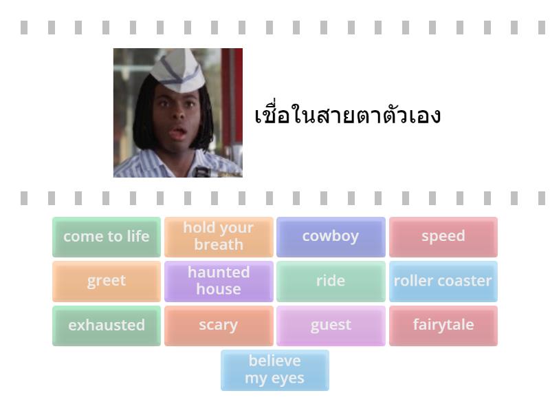 believe my eyes - เชื่อในสายตาตัวเอง, fairytale - เทพนิยาย, greet - ทักทาย , come to life - กลับมามีชีวิต, guest - แขก, cowboy - คาวบอย, ride - ขี่ จักรยาน มอเตอร์ไซต์, scary - น่ากลัว, haunted house - บ้านผีสิง บ้านหลอนๆ, roller coaster - รถไปเหาะ, speed - ความเร็ว, hold your breath - หยุดหายใจ ชั่วขณะ, exhausted - เหนื่อยล้า ,