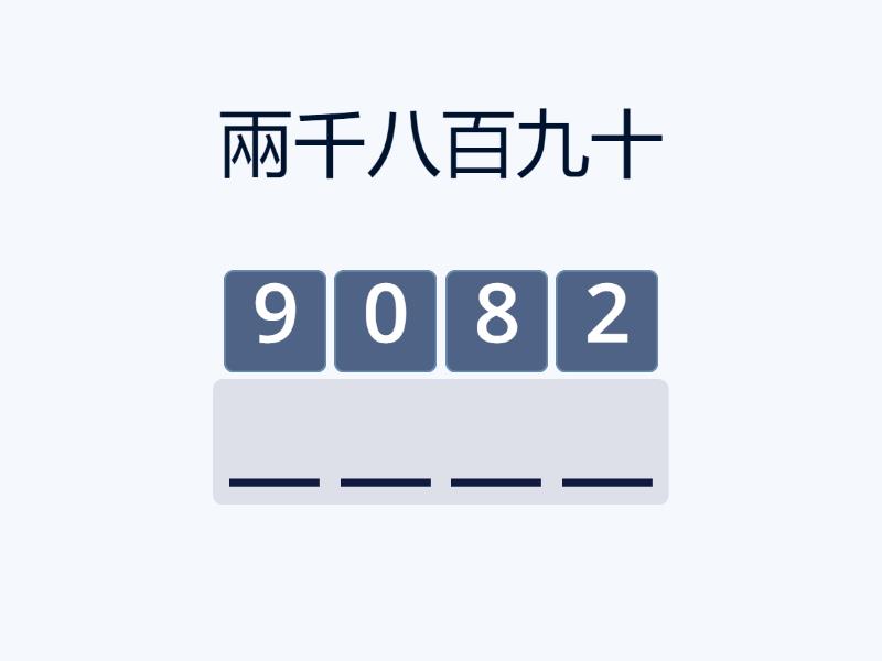 2890 - 兩千八百九十, 3450 - 三千四百五十, 2005 - 兩千零五, 5980 - 五千九百八十, 9909 - 九千九百零九, 1000 - 一千, 3060 - 三千零六十, 4508 - 四千五百零八, 2006 - 兩千零六, 8080 - 八千零八十,