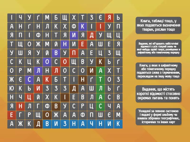 атлас - Укладені за певною системою і видані у формі альбому чи книжки збірники географічних, історичних та інших карт, словник - Книги, у яких в алфавітному або тематичному порядку подаються слова з тлумаченням, перекладом на іншу мову тощо, енциклопедія - Видання, які об’єднують найістотніші відомості з усіх галузей знань чи якої-небудь однієї галузі, розміщених в алфавітному або тематичному порядку, визначник - Книги, таблиці тощо, у яких подаються визначення тварин, рослин тощо, довідник - Видання, що містять короткі відомості стосовно окремих питань та понять,