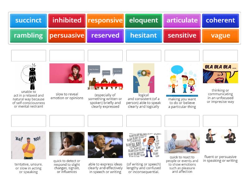 reserved - slow to reveal emotion or opinions, articulate - able to express ideas clearly and effectively in speech or writing, coherent - logical and consistent (of a person) able to speak clearly and logically, hesitant - tentative, unsure, or slow in acting or speaking, eloquent - fluent or persuasive in speaking or writing, responsive - quick to react to people or events and to show emotions such as pleasure and affection, inhibited - unable to act in a relaxed and natural way because of self-consciousness or mental restraint, persuasive - making you want to do or believe a particular thing, sensitive - quick to detect or respond to slight changes, signals, or influences, succinct - (especially of something written or spoken) briefly and clearly expressed, rambling - (of writing or speech) lengthy and confused or inconsequential., vague - thinking or communicating in an unfocused or imprecise way,