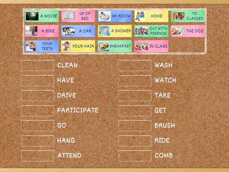 UP OF BED - GET, A SHOWER - TAKE, BREAKFAST - HAVE, YOUR TEETH - BRUSH, YOUR HAIR - COMB , A BIKE - RIDE, A CAR - DRIVE , TO CLASSES - ATTEND, IN CLASS - PARTICIPATE, OUT WITH FRIENDS - HANG , HOME - GO, A MOVIE - WATCH, THE DOG - WASH, MY ROOM - CLEAN,