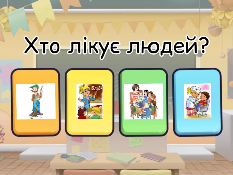 1) Хто лікує людей? a) b) c) d) 2) Хто нас охороняє? a) b) c) d) 3) Хто шиє одяг? a) b) c) d) 4) Хто готує страви? a) b) c) d) 5) Хто продає товари? a) b) c) d) 6) Хто навчає дітей? a) b) c) d) 7) Хто будує будинки? a) b) c) d)