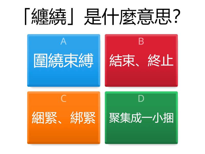 1) 「纏繞」是什麼意思? a) 圍繞束縛 b) 結束、終止 c) 綑緊、綁緊 d) 聚集成一小捆 2) 「施惠勿念」的「勿」是什麼意思? a) 必須 b) 匆忙 c) 不要 d) 一定 3) 「凡事當留餘地」的「餘地」是什麼意思? a) 剩餘的田地 b) 可讓言語或行為緩衝的空間 c) 剩下的機會 d) 檢討行為的空間 4) 「得意不宜再往」的「往」是什麼意思? a) 過去 b) 想念 c) 交往 d) 追求 5) 器具質而潔,「瓦缶」勝金玉。「瓦缶」一詞... a) 鋼鐵 b) 陶器 c) 木器 d) 銀器 6) 「餘地」和下列何者意思相近? a) 退路 b) 空地 c) 餘裕 d) 道理 7) 「受恩莫忘」和下列哪個詞語的意思相似? a) 飲水思源 b) 施惠勿念 c) 忘恩負義 d) 得意忘形 8) 下列何者的意思和「山珍海味」相反? a) 錦衣玉食 b) 粗茶淡飯 c) 珍饈佳肴 d) 鮮衣美食 9) 下列詞語之間的關係,何者是相似詞? a) 莫忘/勿念 b) 受恩/施惠 c) 恆念/常記 d) 簡潔/複雜 10) 下列詞語之間的關係,何者是相反詞? a) 簡潔/簡要 b) 餘地/退路 c) 得意/失意 d) 維艱/艱難 11) 下列哪一個「腹」字的用法與其他三者不同? a) 「腹」痛 b) 口蜜「腹」劍 c) 捧「腹」大笑 d) 「腹」部 12) 下列「纏」字,何者與「纏繞束縛」的「纏」字用法相同? a) 死「纏」爛打 b) 胡攪蠻「纏」 c) 腰「纏」萬貫 d) 這個人真難「纏」 13) 下列各組「」中的字義,何者前後的意思相似? a) 「毋」忘/「毋」須 b) 恩「惠」/「惠」顧 c) 「縷」析/絲「縷」 d) 「預」備/干「預」 14) 下列各組「」中的字義,何者前後的意思不同? a) 「預」備/「預」計 b) 「勿」念/「勿」用 c) 「悲」傷/「悲」天憫人 d) 平「凡」/非「凡」 15) 姐姐平日上課專心聽講,按時複習課業... a) 臨渴掘井 b) 未雨綢繆 c) 樂極生悲 d) 幸災樂禍