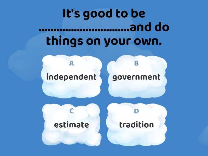 1) It's good to be ...............................and do things on your own. a) independent b) government c) estimate d) tradition 2) Baraa tried to ..................., or guess the weight of his cat . a) landmark b) estimate c) government d) elect 3) Maryam was happy to be one of the............................. a) landmark b) candidates c) elect d) decisions