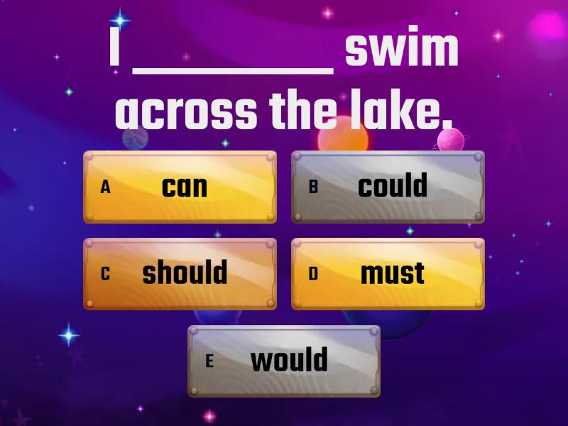 1) I _______ swim across the lake. a) can b) could c) should d) must e) would 2) When I was younger, I ________run much faster. a) can b) could c) should d) must e) would 3) We ________go to the park this weekend if the weather is nice. a) can b) could c) should d) must e) would 4) You ________ try the new restaurant; it’s excellent. a) can b) could c) should d) must e) would 5) ________you pass me the salt, please? a) can b) could c) should d) must e) would 6) ______you help me with this assignment? a) can b) could c) should d) must e) would 7) She ________ be really tired after working all day. a) can b) could c) should d) must e) would 8) We _________leave early to avoid the traffic. a) can b) could c) should d) must e) would 9) If I won the lottery, I _______buy a new house. a) can b) could c) should d) must e) would 10) You ________wear a helmet while riding a bike. a) can b) could c) should d) must e) would 11) ________ you like to join us for dinner? a) can b) could c) should d) must e) would 12) He ________ study harder if he wants to pass the exam. a) can b) could c) should d) must e) would 13) It ______ get very cold in the winter here. a) can b) could c) should d) must e) would 14) We _________ finish this project by tomorrow. a) can b) could c) should d) must e) would 15) _________ you mind helping me with these boxes? a) can b) could c) should d) must e) would