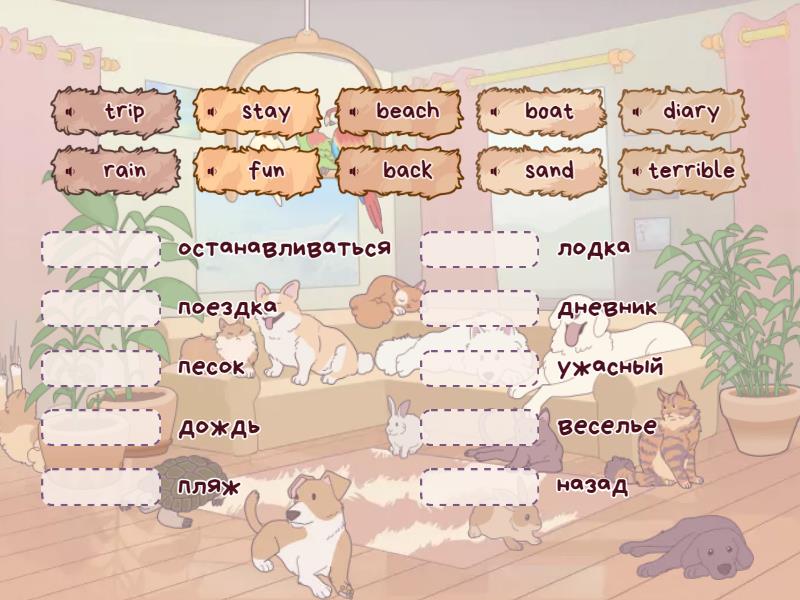 back - назад, beach - пляж, boat - лодка, diary - дневник, fun - веселье, rain - дождь, sand - песок, stay - останавливаться, terrible - ужасный, trip - поездка,
