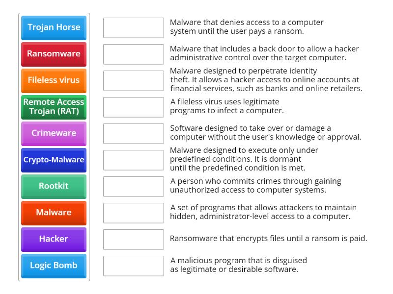 Malware - Software designed to take over or damage a computer without the user's knowledge or approval., Virus - A program that attempts to damage a computer system and replicate itself to other computer systems., Worm - A self-replicating malware program., Trojan Horse - A malicious program that is disguised as legitimate or desirable software., Zombie - A computer that is infected with malware and is controlled by a command and control center called a zombie master., Botnet - A group of zombie computers that are commanded from a central control infrastructure., Rootkit - A set of programs that allows attackers to maintain hidden, administrator-level access to a computer., Logic Bomb - Malware designed to execute only under predefined conditions. It is dormant until the predefined condition is met., Spyware - Software installed without the user's consent or knowledge and is designed to intercept or take partial control of the user's computer., Adware - Malware that monitors a user's personal preferences and sends pop-up ads that match those preferences., Ransomware - Malware that denies access to a computer system until the user pays a ransom., Scareware - A scam to fool a user into thinking there is some form of malware on the system., Crimeware - Malware designed to perpetrate identity theft. It allows a hacker access to online accounts at financial services, such as banks and online retailers., Crypto-Malware - Ransomware that encrypts files until a ransom is paid., Remote Access Trojan (RAT) - Malware that includes a back door to allow a hacker administrative control over the target computer., Hacker - A person who commits crimes through gaining unauthorized access to computer systems., Cracker - A person actively engaged in developing and distributing worms, Trojans, and viruses; engaging in probing and reconnaissance activities; creating toolkits so that others can hack known vulnerabilities; and/or cracking protective measures., Script Kiddie - A less-skilled hacker who often relies on automated tools or scripts written by crackers to scan systems and exploit weaknesses., Potentially Unwanted Program (PUP) - A PUP is a software inadvertently installed that contains adware, installs toolbars, or has other objectives., Fileless virus - A fileless virus uses legitimate programs to infect a computer.,