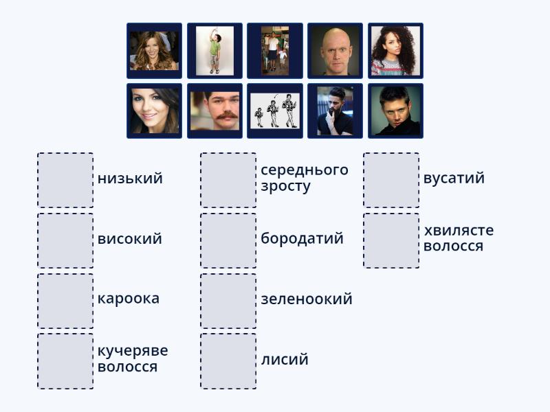 високий, середнього зросту, низький, вусатий, бородатий, лисий, хвилясте волосся, кучеряве волосся , кароока, зеленоокий,