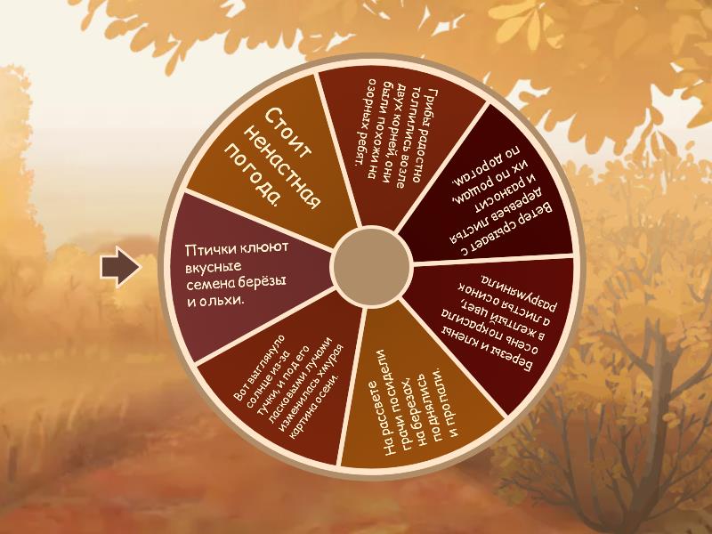 1) Стоит ненастная погода. 2) Грибы радостно толпились возле двух корней, они были похожи на озорных ребят. 3) Ветер срывает с деревьев листья и разносит их по рощам, по дорогам. 4) Березы и клены осень покрасила в желтый цвет, а листья осинок разрумянила. 5) На рассвете грачи посидели на березах, поднялись и пропали. 6) Вот выглянуло солнце из-за тучки, и под его ласковыми лучами изменилась хмурая картина осени. 7) Птички клюют вкусные семена берёзы и ольхи.