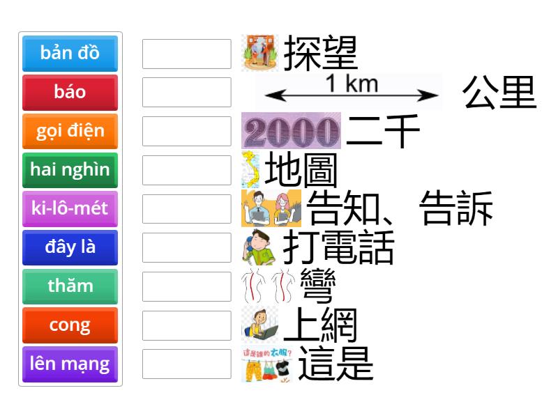 lên mạng - 上網, báo - 告知、告訴, thăm - 探望, ki-lô-mét - 公里, hai nghìn - 二千, đây là - 這是, gọi điện - 打電話, bản đồ - 地圖, cong - 彎,