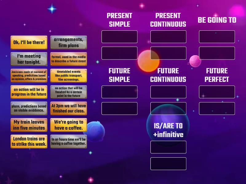 PRESENT SIMPLE: My train leaves inn five minutes, timetabled events like public transport, film screenings., PRESENT CONTINUOUS: I'm meeting her tonight., arrangements, firm plans, BE GOING TO: We're going to have a coffee., plans, predictions based on visible eviddence., FUTURE SIMPLE: Ok, I'll be there!, decisions made at moment of speaking, predictions based on opinion, offers & promises, FUTURE CONTINUOUS: In an hours time we'll be having a coffee together., an action will be in progress in the future, FUTURE PERFECT: At 3pm we will have finished our class., an action that will be finished by a certain point in the future, IS/ARE TO +infinitive: London trains are to strike this week., formal, used in the media to describe a future event,