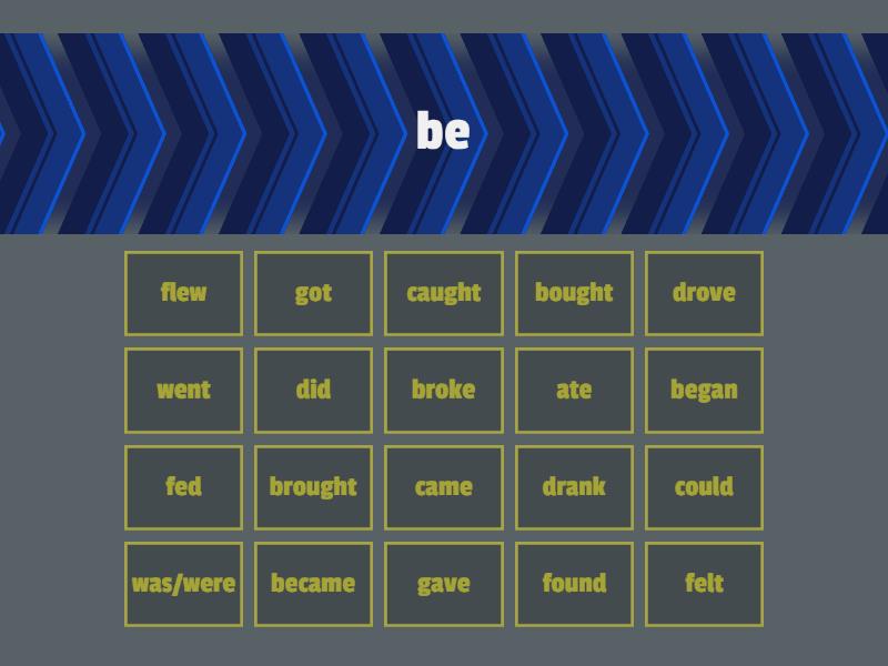 was/were - be, became - become, began - begin, broke - break, brought - bring, bought - buy, could - can, caught - catch, came - come, did - do, drank - drink, drove - drive, ate - eat, fed - feed, felt - feel, found - find, flew - fly, got - get , gave - give, went - go,