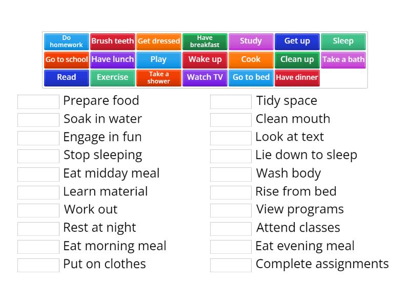 Wake up - Stop sleeping, Get up - Rise from bed, Brush teeth - Clean mouth, Take a shower - Wash body, Get dressed - Put on clothes, Have breakfast - Eat morning meal, Go to school - Attend classes, Study - Learn material, Have lunch - Eat midday meal, Do homework - Complete assignments, Play - Engage in fun, Have dinner - Eat evening meal, Take a bath - Soak in water, Read - Look at text, Watch TV - View programs, Go to bed - Lie down to sleep, Sleep - Rest at night, Exercise - Work out, Cook - Prepare food, Clean up - Tidy space,