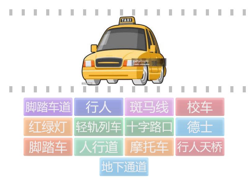 德士, 校车, 摩托车, 轻轨列车, 斑马线, 行人, 人行道, 脚踏车, 脚踏车道, 地下通道, 行人天桥, 红绿灯, 十字路口,