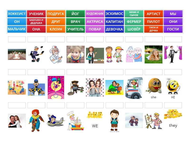 ЭСКИМОС, КЛОУН, ПИЛОТ, КАПИТАН, ПОВАР, УЧЕНИК, ДЕВОЧКА, МАЛЬЧИК, БАБУШКА И ДЕДУШКА, МАМА И СЫНОК, ПАПА И ДОЧКА , ОНА - she, ОН - HE, ОНИ - they, МЫ - WE, АКТРИСА, ГОСТИ, ЙОГ, ДРУГ, ПОДРУГА, АРТИСТ, ФЕРМЕР, ХУДОЖНИК , ХОККЕИСТ, УЧИТЕЛЬ, ШОВЁР, ВРАЧ,