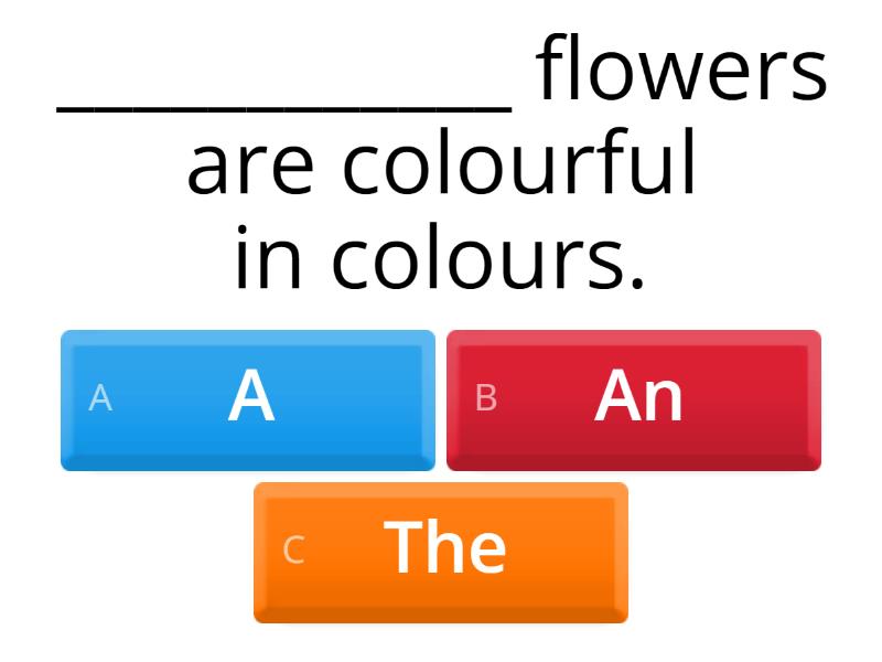 1) ____________ flowers are colourful in colours. a) A b) An c) The 2) I bought ____ bouquet of yellow roses for my mother on Mother's Day. a) a b) an c) the 3) Jennie's mother is __________ owner. a) a b) an c) the 4) _____________ orchid flower caught my eyes. a) A b) An c) The 5) __________ pink tulip and __________ daisies are beautiful. a) A..... a b) An..... an c) The..... the