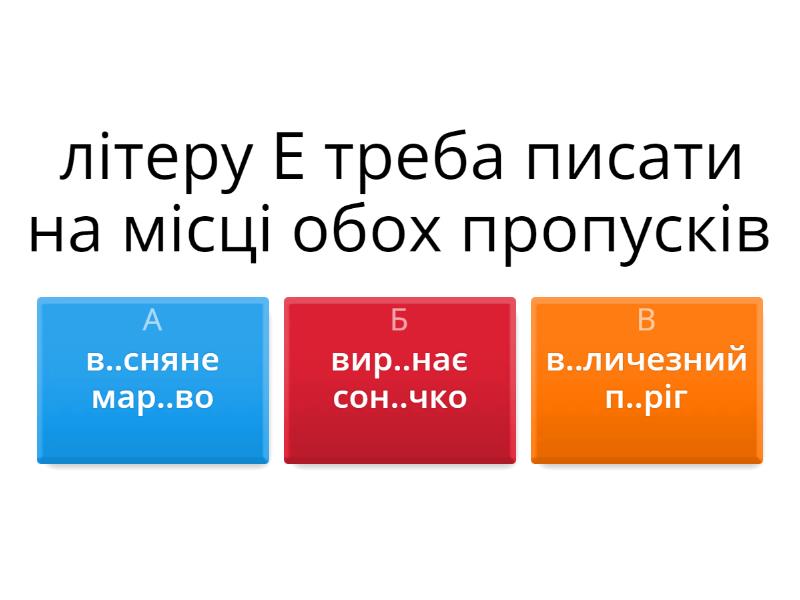 1) літеру Е треба писати на місці обох пропусків a) в..сняне мар..во b) вир..нає сон..чко c) в..личезний п..ріг 2) літеру Е треба писати в усіх словах рядка a) сут..ніти, лиц..дій b) віт..рець, зач..кати c) кр..шталик, в..селка 3) літеру Е треба писати в усіх словах рядка a) б..ти, в..рховний b) кл..котіти, прич..пити c) р..місник, ц..тата 4) літеру Е треба писати в усіх словах рядка a) кор..до, розробл..ний b) р..шітце, кач..чка c) ск..лястий, реч..татив 5) літеру Е треба писати в усіх словах рядка a) щеб...тати, д..ржати b) л..дацюга, ст..хати c) зал..вати, майст..р 6) літеру И на місці пропуску треба писати в усіх словах рядка a) мереж..во, вел..чезний b) с..нус, пєд..стал c) л..иман,мар..во 7) літеру И треба писати в усіх словах рядка a) зуп..нився,приб..р..гти b) ш..лестіти, кр..шити c) Бр..ніти, вкр..вається 8) помилку допущено в словах a) шелестіти, невмирущий, бентежити b) ледацюга, марево, клекотіти c) книжечка, квітень, гусениця