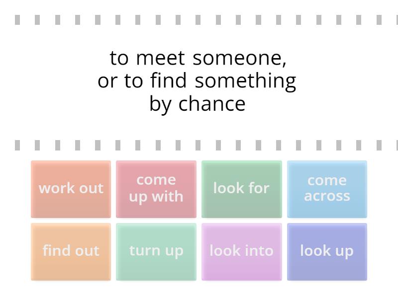 come across - to meet someone, or to find something by chance, come up with - to think of something such as an idea or a plan, find out - to discover a fact or piece of information, look for - to search for someone or something, look into - to try to discover the facts about something such as a problem or a crime, look up - to try to find a particular piece of information by looking in a book or on a list, or by using a computer, turn up - to happen unexpectedly or by chance, work out - to solve a problem by doing a calculation,