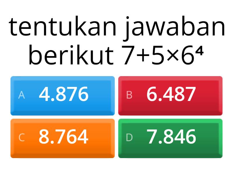 1) tentukan jawaban berikut 7+5×6⁴ a) 4.876 b) 6.487 c) 8.764 d) 7.846 2) tentukan jawaban berikut 7²×7⁵ a) 7⁷ b) 7³ c) 7⁸ d) 7² 3) jawablah perttanyaan berikut ini 2x²+5x-12=0 a) x=-4, x=3/2 b) x=8, x= 8/4 c) x=3, x=⅚ d) x=12, x= ⅜ 4) akar persamaan kuadrat dari x²-7x+6=0 a) -7 dan 6 b) 1 dan 6 c) 2 dan 3 d) -1 dan 6 5) jenis akar dari x²+x+3 a) mempunyai dua akar sama b) mempunyai dua akar real berbeda c) mempunyai akar tidak real d) mempunyai dua akar real dan berbeda