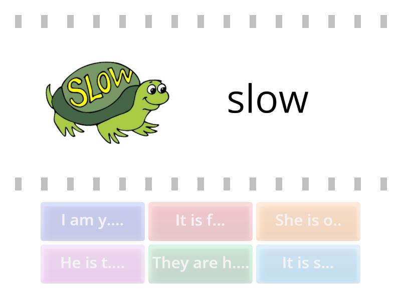 It is s... - slow, It is f... - fast, She is o.. - old, They are h.... - happy, He is t.... - tired, I am y.... - young,