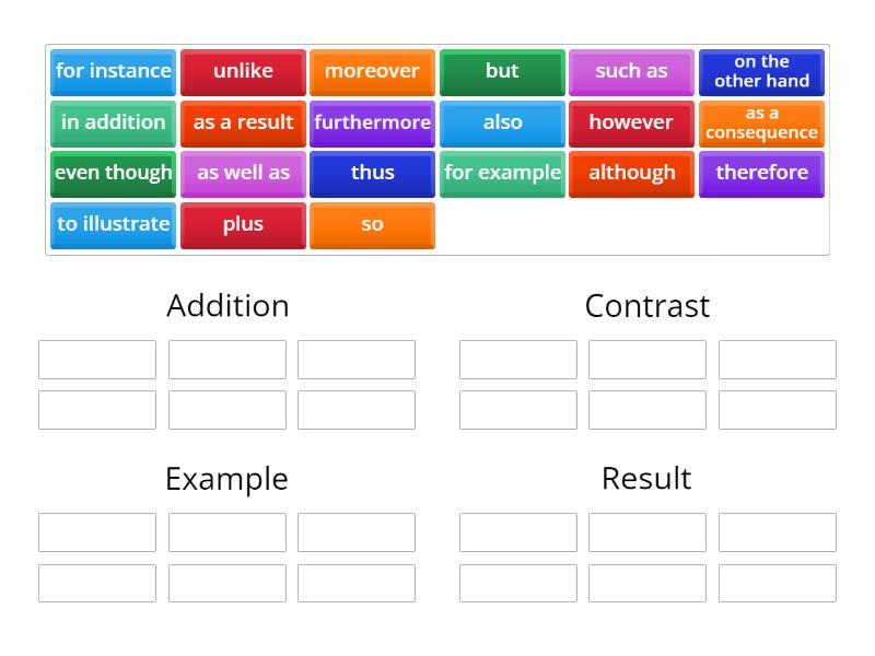 Addition: also, plus, as well as, furthermore, moreover, in addition, Contrast: but, however, on the other hand, although, even though, unlike, Example: for example, for instance, such as, to illustrate , Result: as a result, so, therefore, thus, as a consequence ,
