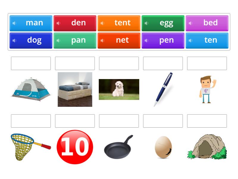 dog, ten, bed, egg, net, pan, man, pen, den, tent,