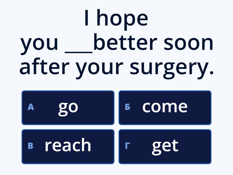 1) I hope you ___better soon after your surgery. a) go b) come c) reach d) get 2) The board finally ___a decision about the new project. a) went b) came c) reached d) got 3) After a long time, she finally ___to terms with her loss. a) goes b) comes c) reaches d) gets 4) Be careful not to ___into trouble at school. a) go b) come c) reach d) get 5) It ___dark early in winter. a) goes b) comes c) reaches d) gets 6) I couldn't ___to sleep because I was too excited. a) go b) come c) reach d) get 7) We need to ___rid of these old clothes. a) go b) come c) reach d) get 8) I need an hour to ___ready for the party. a) go b) come c) reach d) get 9) If you're late again, you might ___the sack. a) go b) come c) reach d) get 10) This tool might ___in handy when we're fixing the car. a) go b) come c) reach d) get 11) He was determined to ___revenge on his rival. a) go b) come c) reach d) get 12) She ___red when she realizes her mistake. a) goes b) comes c) reaches d) gets 13) After hours of negotiation, they decided to ___an agreement. a) go b) come c) reach d) get 14) We ___lost in the city regularly. a) go b) come c) reach d) get 15) I hope I ___the job after the interview. a) go b) come c) reach d) get 16) His constant complaining really ___on my nerves. a) goes b) comes c) reaches d) gets 17) I wish you would ___off my back about cleaning the house. a) go b) come c) reach d) get 18) Let's ___down to business and start the meeting. a) go b) come c) reach d) get 19) His reaction ___totally over the top. a) goes b) comes c) reaches d) gets 20) She vowed to ___even with him for embarrassing her. a) go b) come c) reach d) get
