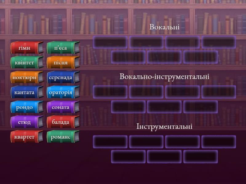 Вокальні: балада, романс, серенада, пісня, гімн, Вокально-інструментальні: кантата, ораторія, Інструментальні: ноктюрн, п'єса, соната, етюд, рондо, квартет, квінтет,