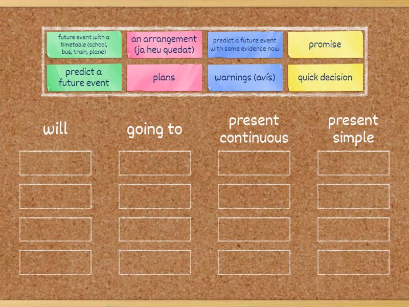 will: predict a future event, quick decision, promise, warnings (avís), going to: plans, predict a future event with some evidence now, present continuous: an arrangement (ja heu quedat), present simple: future event with a timetable (school, bus, train, plane),