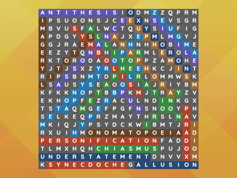 Metaphor, Simile, Personification, Hyperbole, Onomatopoeia, Oxymoron, Idiom, Alliteration, Assonance, Synecdoche, Metonymy, Imagery, Understatement, Euphemism, Irony, Pun, Symbolism, Apostrophe, Litotes, Allusion, Anaphora, Chiasmus, Antithesis, Paradox, Zeugma,