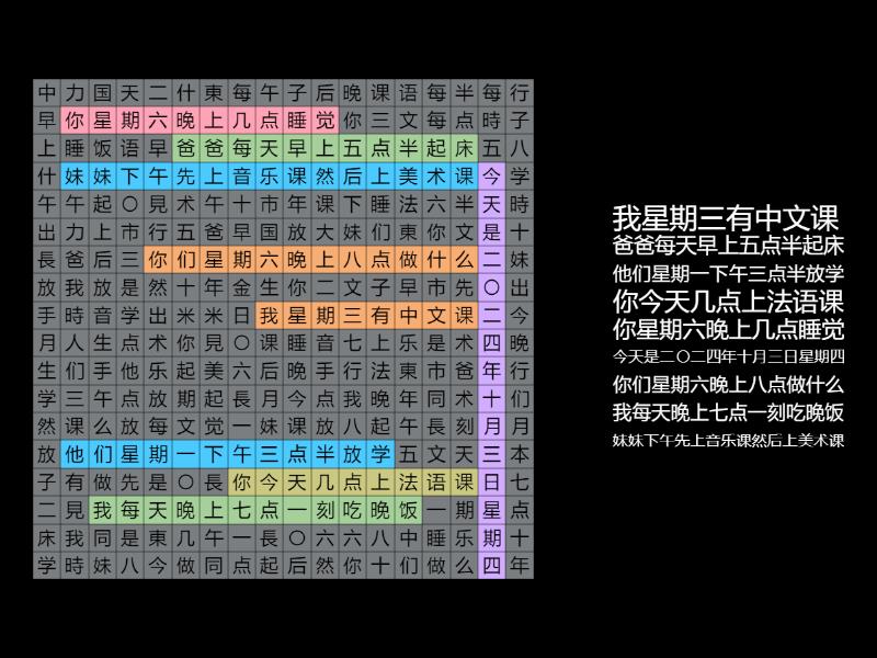 我星期三有中文课, 爸爸每天早上五点半起床, 他们星期一下午三点半放学, 你今天几点上法语课, 你星期六晚上几点睡觉, 今天是二〇二四年十月三日星期四, 你们星期六晚上八点做什么, 我每天晚上七点一刻吃晚饭, 妹妹下午先上音乐课然后上美术课,