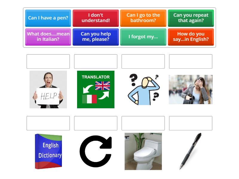 Can I go to the bathroom?, Can I have a pen?, Can you help me, please?, How do you say...in English?, What does....mean in Italian?, I forgot my..., Can you repeat that again?, I don't understand!,
