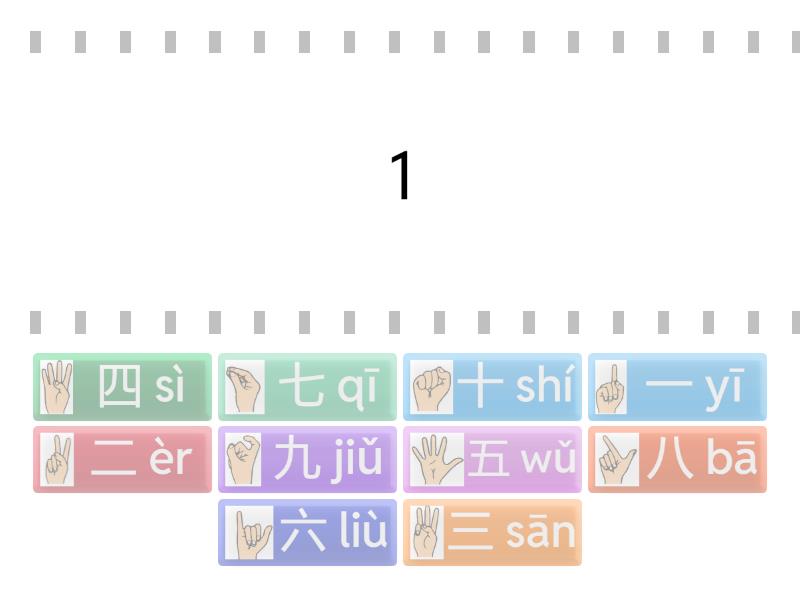 一 yī - 1, 二 èr - 2, 三 sān - 3, 四 sì - 4, 五 wǔ - 5, 六 liù - 6, 七 qī - 7, 八 bā - 8, 九 jiǔ - 9, 十 shí - 10,