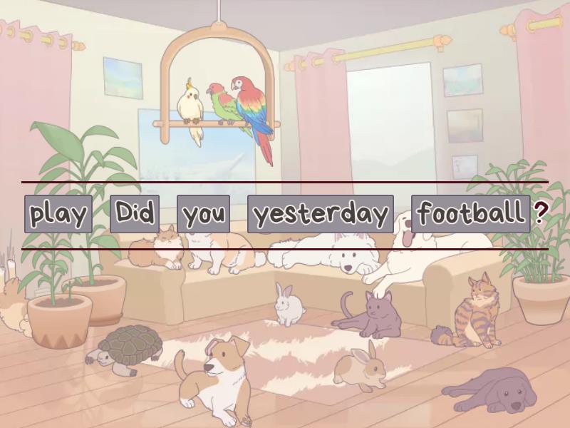 Did you play football yesterday?, What did she do last weekend?, Did we watch a movie together?, When did he study for the test?, Did they clean the house?, Who did you see yesterday?, Where did we travel last summer?, Did your mum cook a meal yesterday?, Did you go to the park yesterday?,