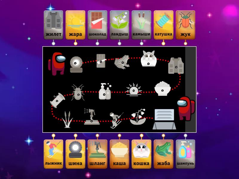 шина, шоколад, жаба, кошка, жилет, каша, жара, шампунь, жук, катушка, камыши, шланг, лыжник, ландыш.