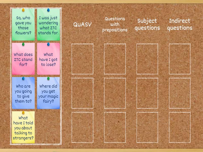 QuASV: What have I got to lose?, Where did you get your magic fairy?, What have I told you about talking to strangers?, Questions with prepositions: Who are you going to give them to?, What does ZTC stand for?, Subject questions: So, who gave you those flowers?, Indirect questions: I was just wondering what ZTC stands for.,