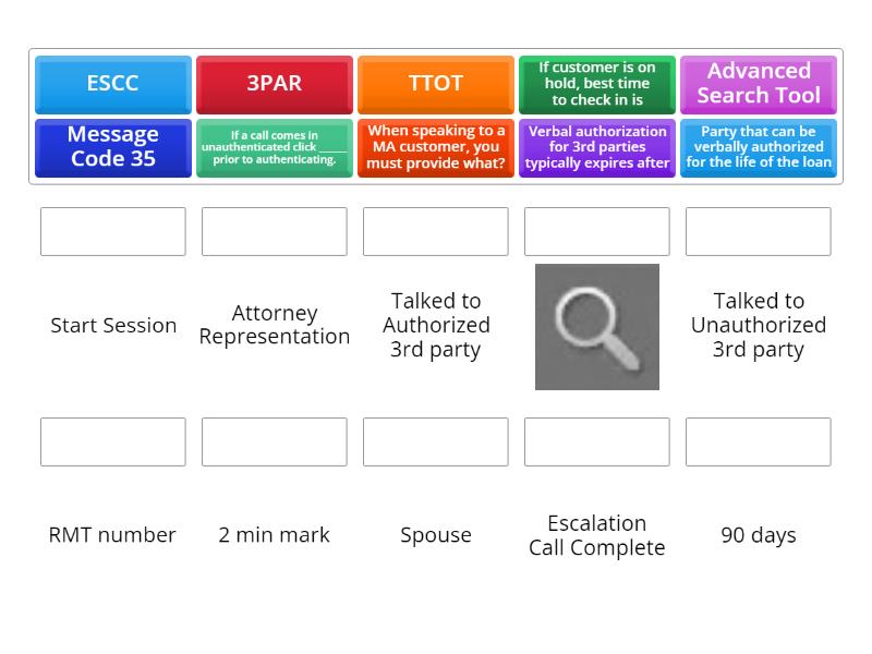 Extended Hold - Any hold over 3 minutes, results in QA point loss, If customer is on hold, best time to check in is - 2 min mark, Silent holds longer than _______ result in QA deduction. - 60 seconds, Full Demo - Confirm all contact information and any alternate phone numbers, If a call comes in unauthenticated click ______ prior to authenticating. - Start Session, TTMR - Talked to Customer, 3PAR - Talked to Authorized 3rd party, TTOT - Talked to Unauthorized 3rd party, Verbal authorization for 3rd parties typically expires after - 90 days, Party that can be verbally authorized for the life of the loan - Spouse, When speaking to a MA customer, you must provide what? - RMT number, Message Code 35 - Attorney Representation, Message Code 91 - Legal - no calls, Interview Tab - Checklist for ensuring QA compliance, Advanced Search Tool, Loan History, Add Authorized 3rd Party, Escalation Acknowledgement - ESCA, LRVW - Manager Reviewed Loan, ESCC - Escalation Call Complete,
