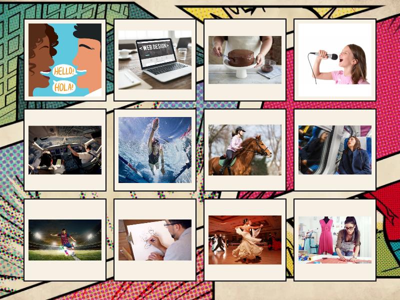 Build a website, Dance, Draw pictures, Fly a plane, Make a cake, Make clothes, Play football, Ride a horse, Sing, Sleep on a train, Speak two languages, Swim,