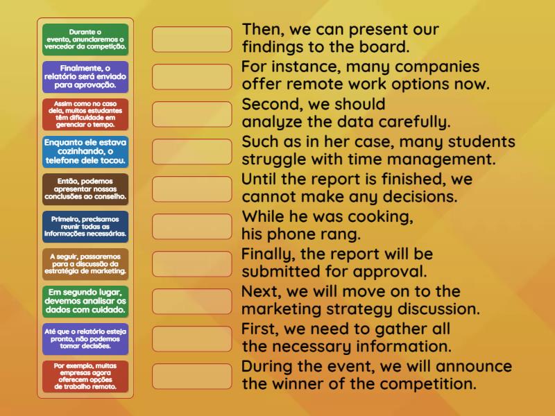 Durante o evento, anunciaremos o vencedor da competição. - During the event, we will announce the winner of the competition., Enquanto ele estava cozinhando, o telefone dele tocou. - While he was cooking, his phone rang., Até que o relatório esteja pronto, não podemos tomar decisões. - Until the report is finished, we cannot make any decisions., A seguir, passaremos para a discussão da estratégia de marketing. - Next, we will move on to the marketing strategy discussion., Primeiro, precisamos reunir todas as informações necessárias. - First, we need to gather all the necessary information., Em segundo lugar, devemos analisar os dados com cuidado. - Second, we should analyze the data carefully., Então, podemos apresentar nossas conclusões ao conselho. - Then, we can present our findings to the board., Finalmente, o relatório será enviado para aprovação. - Finally, the report will be submitted for approval., Por exemplo, muitas empresas agora oferecem opções de trabalho remoto. - For instance, many companies offer remote work options now., Assim como no caso dela, muitos estudantes têm dificuldade em gerenciar o tempo. - Such as in her case, many students struggle with time management.,
