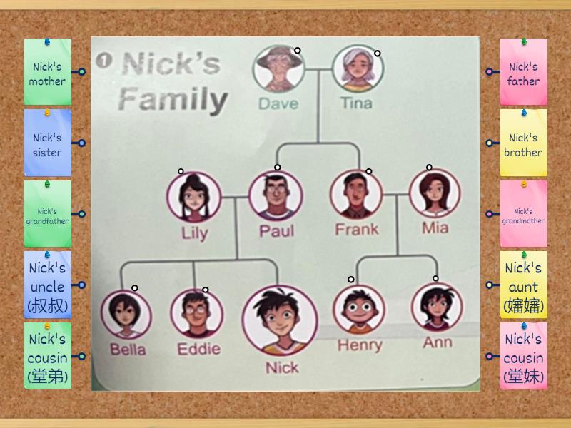 Nick's mother, Nick's father, Nick's sister, Nick's brother, Nick's grandfather, Nick's grandmother, Nick's uncle (叔叔), Nick's aunt (嬸嬸) , Nick's cousin (堂弟), Nick's cousin (堂妹).