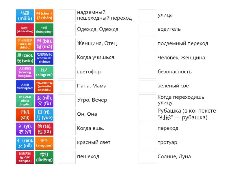 马路 (mǎlù) - улица, 人行道 (rénxíngdào) - тротуар, 人行横道 (rénxíng héngdào) - переход, 过街天桥 (guòjiē tiānqiáo) - надземный пешеходный переход, 地下通道 (dìxià tōngdào) - подземный переход, 信号灯 (xìnhàodēng) - светофор, 红灯 (hóngdēng) - красный свет, 绿灯 (lǜdēng) - зеленый свет, 行人 (xíngrén) - пешеход, 司机 (sījī) - водитель, 安全 (ānquán) - безопасность, 过马路的时候 (guò mǎlù de shíhòu) - Когда переходишь улицу., 吃饭的时候 (chīfàn de shíhòu) - Когда ешь., 学习的时候 (xuéxí de shíhòu) - Когда учишься., 日 (rì), 月 (yuè) - Солнце, Луна, 亻 (rén), 女 (nǚ) - Человек, Женщина, 衤 (yī), 衣 (yī) - Одежда, Одежда, 女 (nǚ), 父 (fù) - Женщина, Отец, 早 (zǎo), 晚 (wǎn) - Утро, Вечер, 他 (tā), 她 (tā) - Он, Она, 衬 (chèn), 衫 (shān) - Рубашка (в контексте "衬衫" — рубашка), 爸 (bà), 妈 (mā) - Папа, Мама,