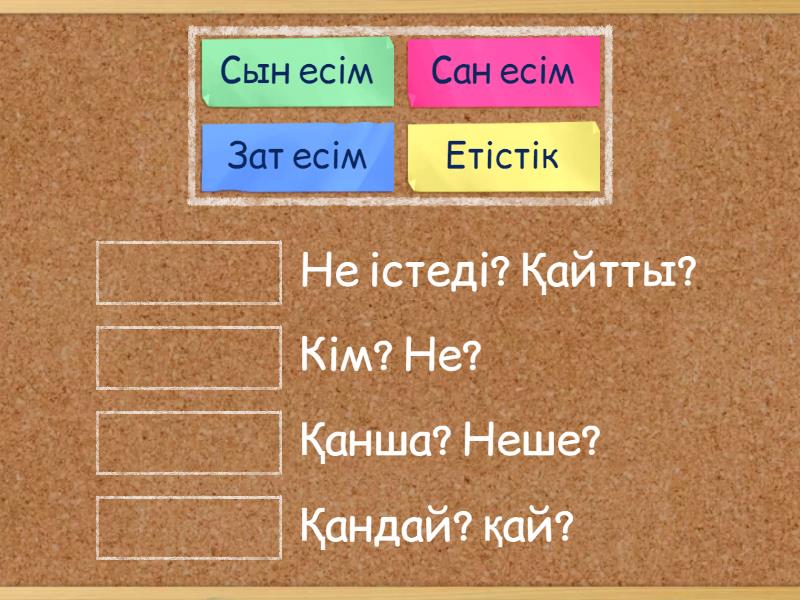 Зат есім - Кім? Не?, Сын есім - Қандай? қай?, Етістік - Не істеді? Қайтты?, Сан есім - Қанша? Неше? ,