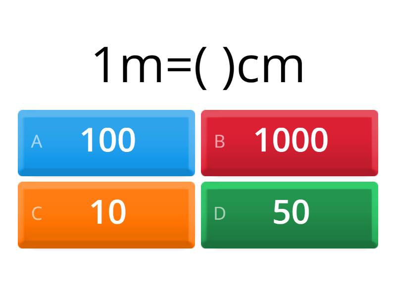 1) 1m=( )cm a) 100 b) 1000 c) 10 d) 50 2) 1m=( )mm a) 1000 b) 100 c) 10 d) 50 3) 15m=( )cm a) 15 b) 150 c) 1500 d) 15000 4) 240mm=( )cm a) 24 b) 240 c) 2400 d) 24000 5) 1m5mm+2m4mm=( ) a) 3m9mm b) 4m4mm c) 5m 2mm d) 15m 24mm 6) 2cm-20mm=( ) a) 0 b) 10 c) 20 d) 200 7) 2cm5mm=( )mm a) 25 b) 26 c) 27 d) 28 8) 1m2cm=( )cm a) 102 b) 120 c) 201 d) 12 9) 5cm2mm=( )mm a) 52 b) 25 c) 520 d) 10 10) 6cm5mm- 5cm6mm=( )mm a) 10 b) 9 c) 8 d) 7