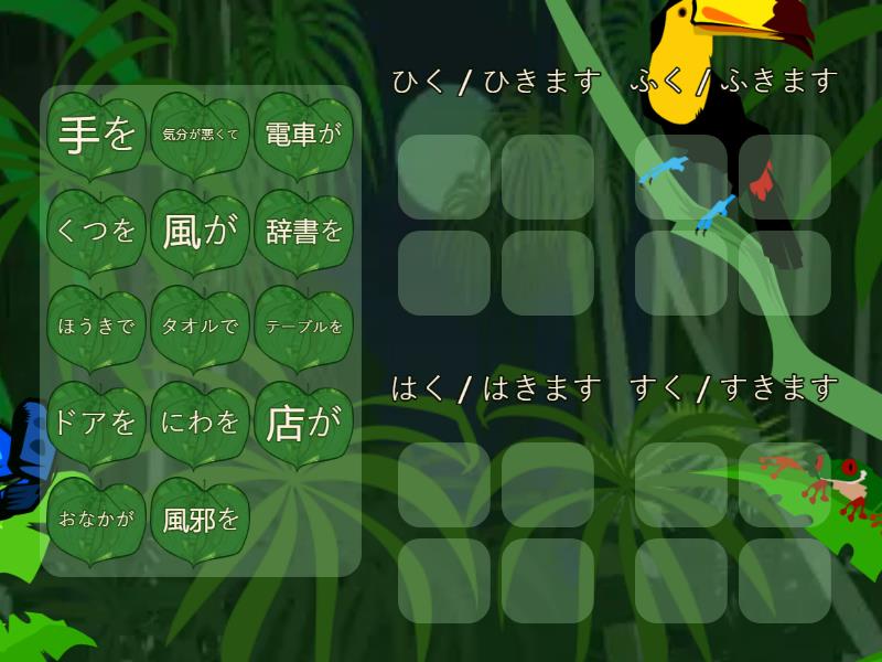 ひく/ひきます: ドアを, 風邪を, 辞書を, ふく/ふきます: 風が, 手を, テーブルを, タオルで, はく/はきます: ほうきで, 気分が悪くて, くつを, にわを, すく/すきます: おなかが, 店が, 電車が,