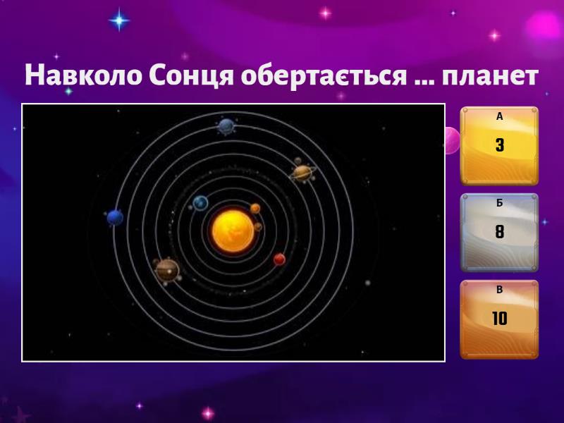 1) Навколо Сонця обертається ... планет a) 3 b) 8 c) 10 2) Шлях, яким планети рухаються навколо Сонця, називають ... a) орбітою b) екватором 3) Сонце - це... a) Планета b) Зірка c) Астероїд 4) Супутник планети Землі - це... a) Меркурій b) Венера c) Місяць 5) Великі розпечені газові кулі - це ... a) Метеорити b) Зорі c) Комети 6) Найближча до планети Земля зоря - це... a) Полярна зоря b) Сонце 7) Як називається наша галактика? a) Молочний шлях b) Сонячний шлях c) Невідомий шлях 8) Перший політ у космос здійснив? a) Юрій Гагарін b) Леонід Каденюк 9) Першим космонавтом незалежної України став? a) Юрій Гагарін b) Леонід Каденюк