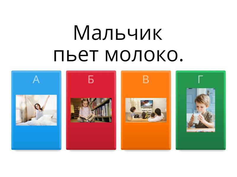 1) Мальчик пьет молоко. a) b) c) d) 2) Тётя встаёт рано. a) b) c) d) 3) Дядя ужинает. a) b) c) d) 4) Тётя идет. a) b) c) d) 5) Семья смотрит телевизор. a) b) c) d) 6) Девочка читает книгу. a) b) c) d) 7) Дядя и тётя разговаривают. a) b) c) d) 8) Мальчик слушает музыку. a) b) c) d) 9) Тётя думает. a) b) c) d) 10) Учитель пишет на доске. a) b) c) d) 11) МАЛЬЧИК ПЛАВАЕТ. a) b) c) d) e) f) 12) МАЛЬЧИК ОТКРЫВАЕТ ДВЕРЬ. a) b) c) d) e) f) 13) ДЕВОЧКА МОЕТ ПОСУДУ. a) b) c) d) e) f) 14) ДЯДЯ ПОКУПАЕТ ПРОДУКТЫ. a) b) c) d) e) f) 15) ДЯДЯ РАБОТАЕТ ЗА КОМПЬЮТЕРОМ. a) b) c) d) e) f)