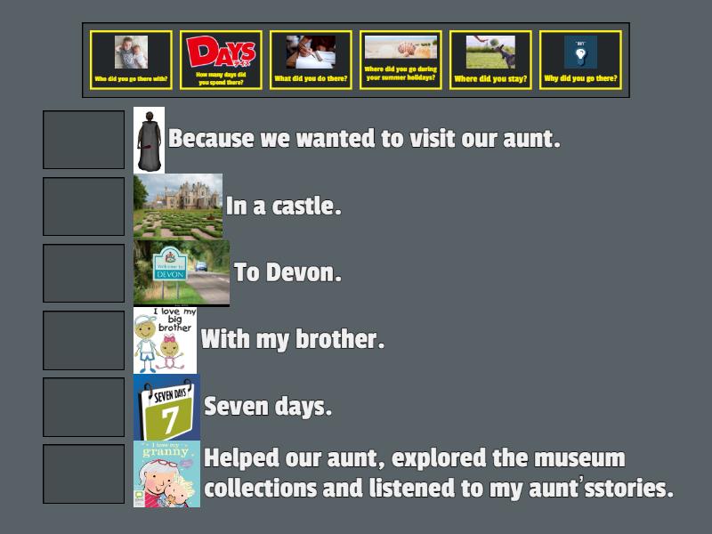 Where did you go during your summer holidays? - To Devon., Who did you go there with? - With my brother., Where did you stay? - In a castle., Why did you go there? - Because we wanted to visit our aunt., What did you do there? - Helped our aunt, explored the museum collections and listened to my aunt’sstories. , How many days did you spend there? - Seven days.,