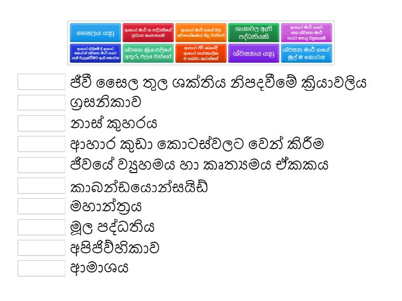 ආහාර මාර් ගයට සහ ශ්වසන මාර් ගයට පොදු ව්යුහයකි - ග්රසනිකාව, ශ්වසන මාර් ගයේ මුල් ම කොටස - නාස් කුහරය, ආහාර මාර් ගයේ ජල අවශෝෂණය සිදු වන්නේ - මහාන්ත්රය, ආහාර ජීර් ණයේදී ආහාර තාවකාලික ව ගබඩා කරන්නේ - ආමාශය, ශ්වසනය යනු - ජීවී සෛල තුල ශක්තිය නිපදවීමේ ක්රියාවලිය, ආහාර මාර් ග පද්ධතියේ ප්රධාන කෘත්යයකි - ආහාර කුඩා කොටස්වලට වෙන් කිරීම, ශ්වසන ක්රියාවලියේ අතුරු ඵලය වන්නේ - කාබන්ඩයොන්සයිඩ්, සෛලය යනු - ජීවයේ ව්යුහමය හා කෘත්යමය ඒ්කකය, ශාකවල ඇති පද්ධතියකි - මූල පද්ධතිය, ආහාර ගිලීමේ දී ආහාර කොටස් ශ්වසන මාර් ගයට යෑම වැලැක්වීමට ඇති කොටස - අපිජිව්හිකාව,