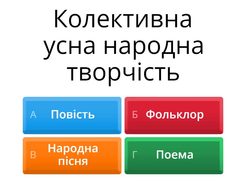 1) Колективна усна народна творчість a) Повість b) Фольклор c) Народна пісня d) Поема 2) Найдавніші за походженням пісні a) Календарно-обрядові b) Купальські c) Русальні d) Колискові 3) Пісні зимового циклу a) Купальські,русальні b) Колядки, щедрівки c) Жниварські d) Гагілки,пісні-ігри 4) "Нова радість стала" a) Колядка b) Щедрівки c) Гагілки d) Гаївки 5) "Щедрик, щедрик, щедрівочка" a) Щедрівка b) Колядка c) Пісні-ігри d) Гаївки