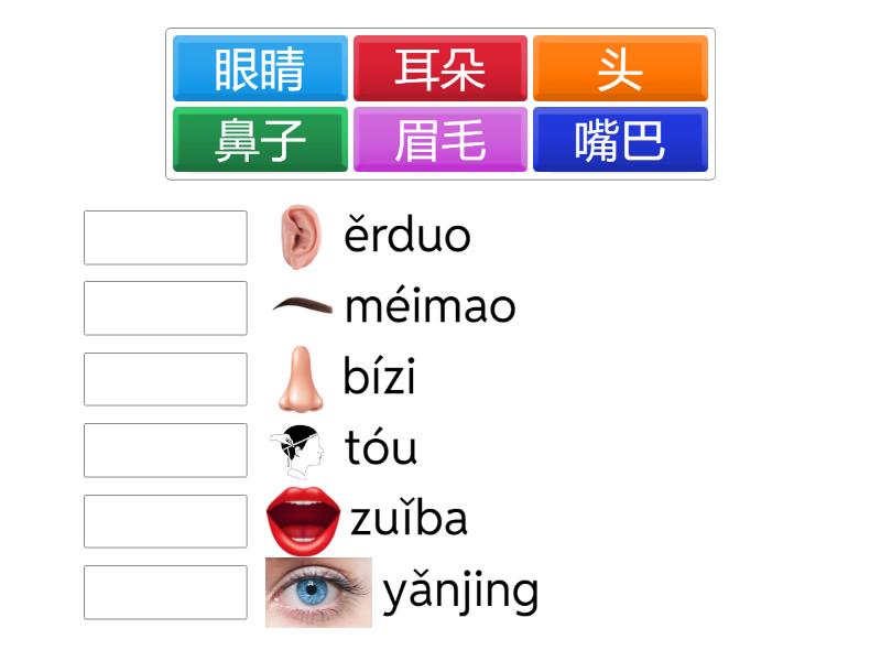 眼睛 - yǎnjing, 鼻子 - bízi, 眉毛 - méimao, 嘴巴 - zuǐba, 耳朵 - ěrduo, 头 - tóu,